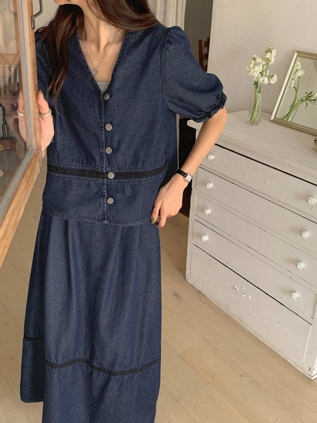 Women V-Neck Short Sleeve Denim Top And Skirt Set