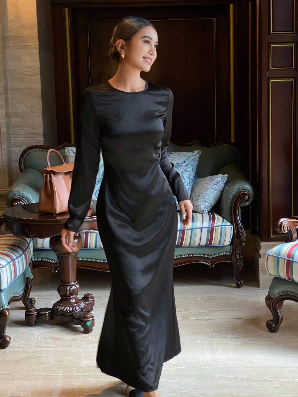 Women's Elegant Long Sleeve Fitted Waist Round Neck Dress, Solid Color, Autumn/Winter