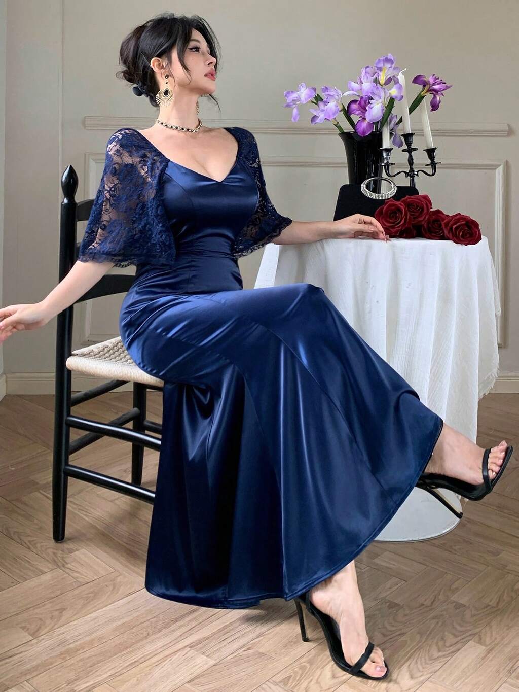 Women's Elegant Lace Patchwork Belted Mid-Length Dress, Spring/Summer Wedding Guest Dress Maxi Dress Sundress