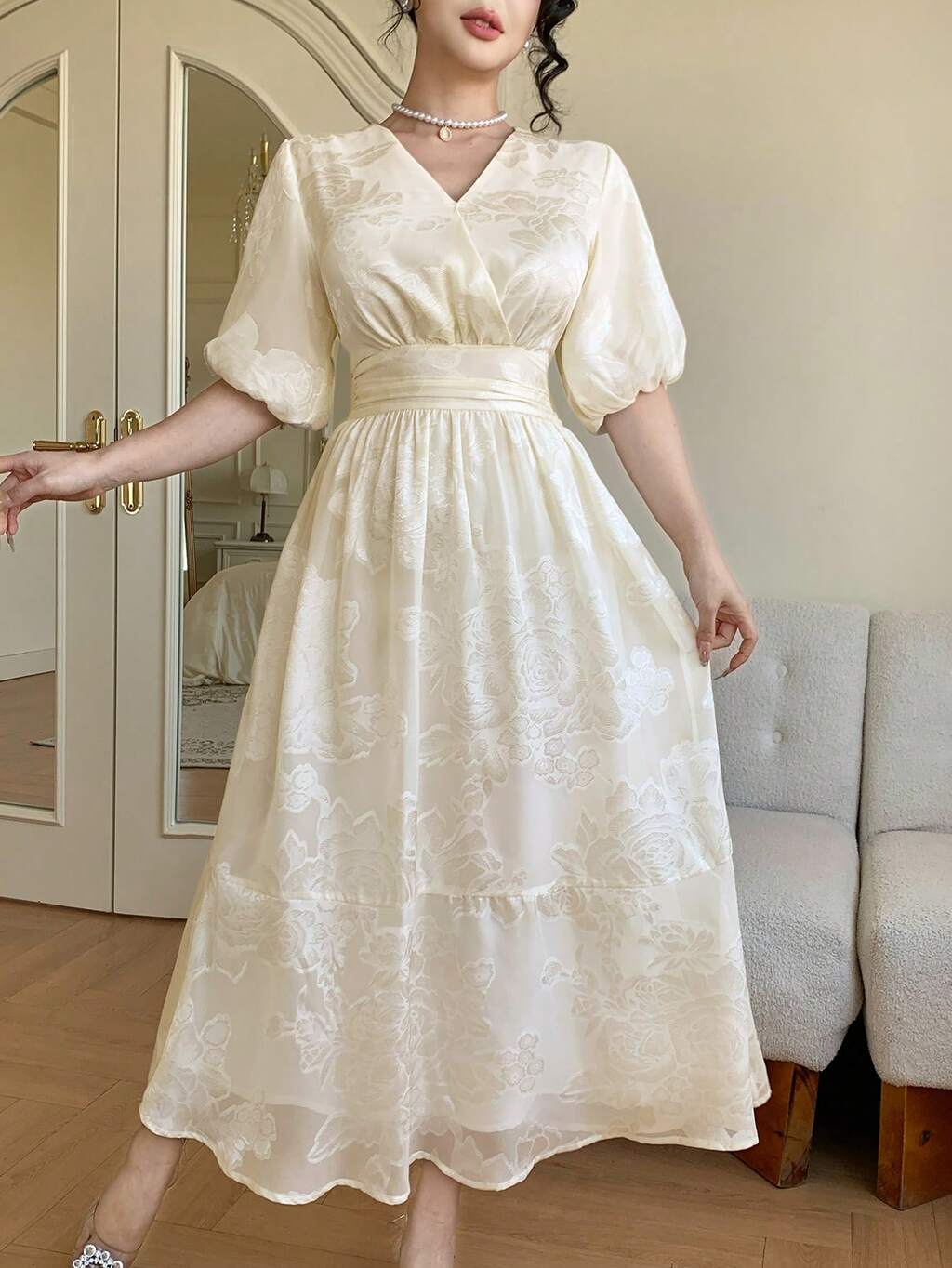Robe mi-longue élégante à manches lanternes et col V avec motif floral, robe d'invitée de mariage d'été