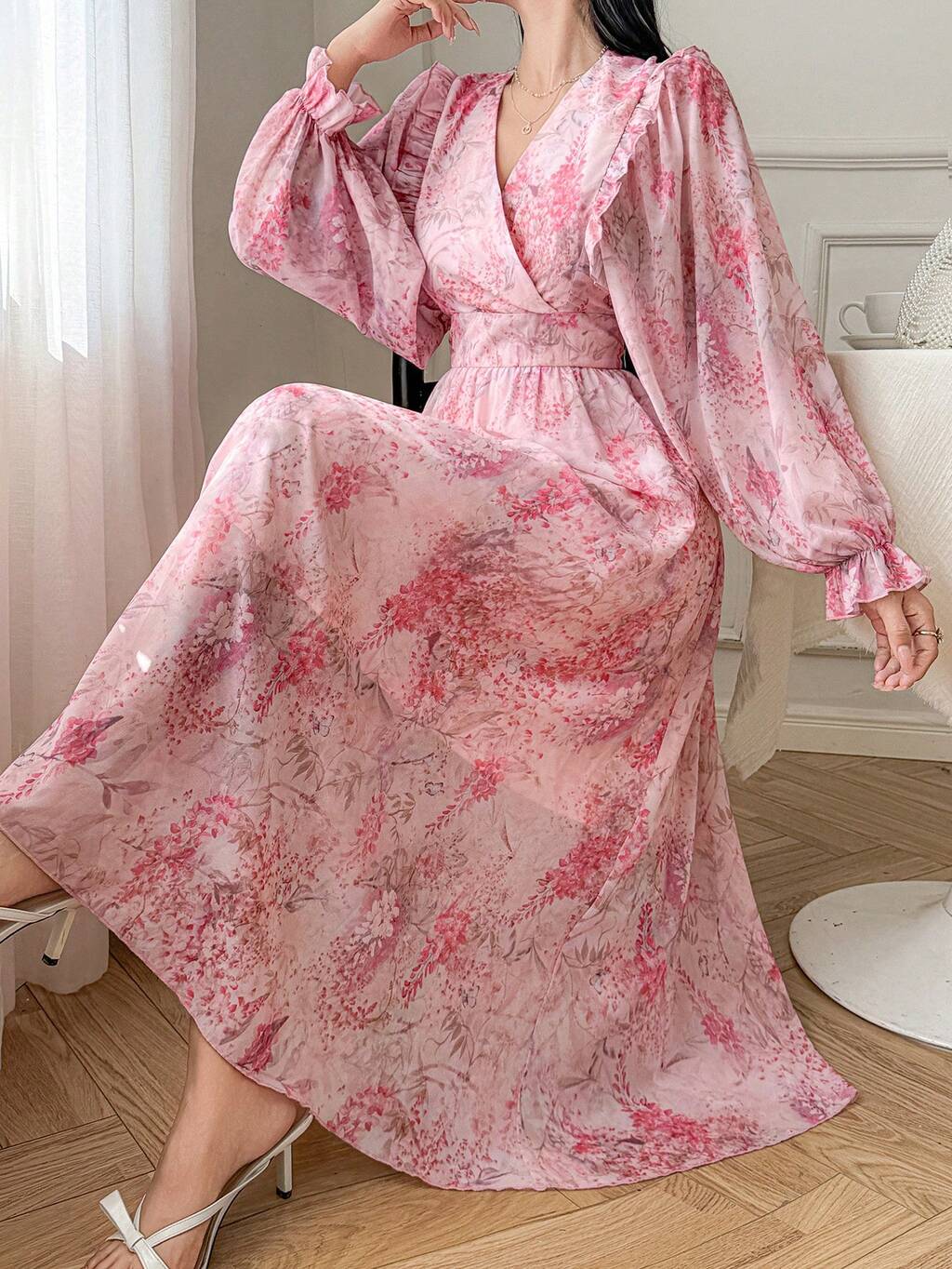 Robe mi-mollet pour femmes à col en V, manches à volants, imprimé floral de style chinoiserie. Robe longue à manches longues pour l'automne