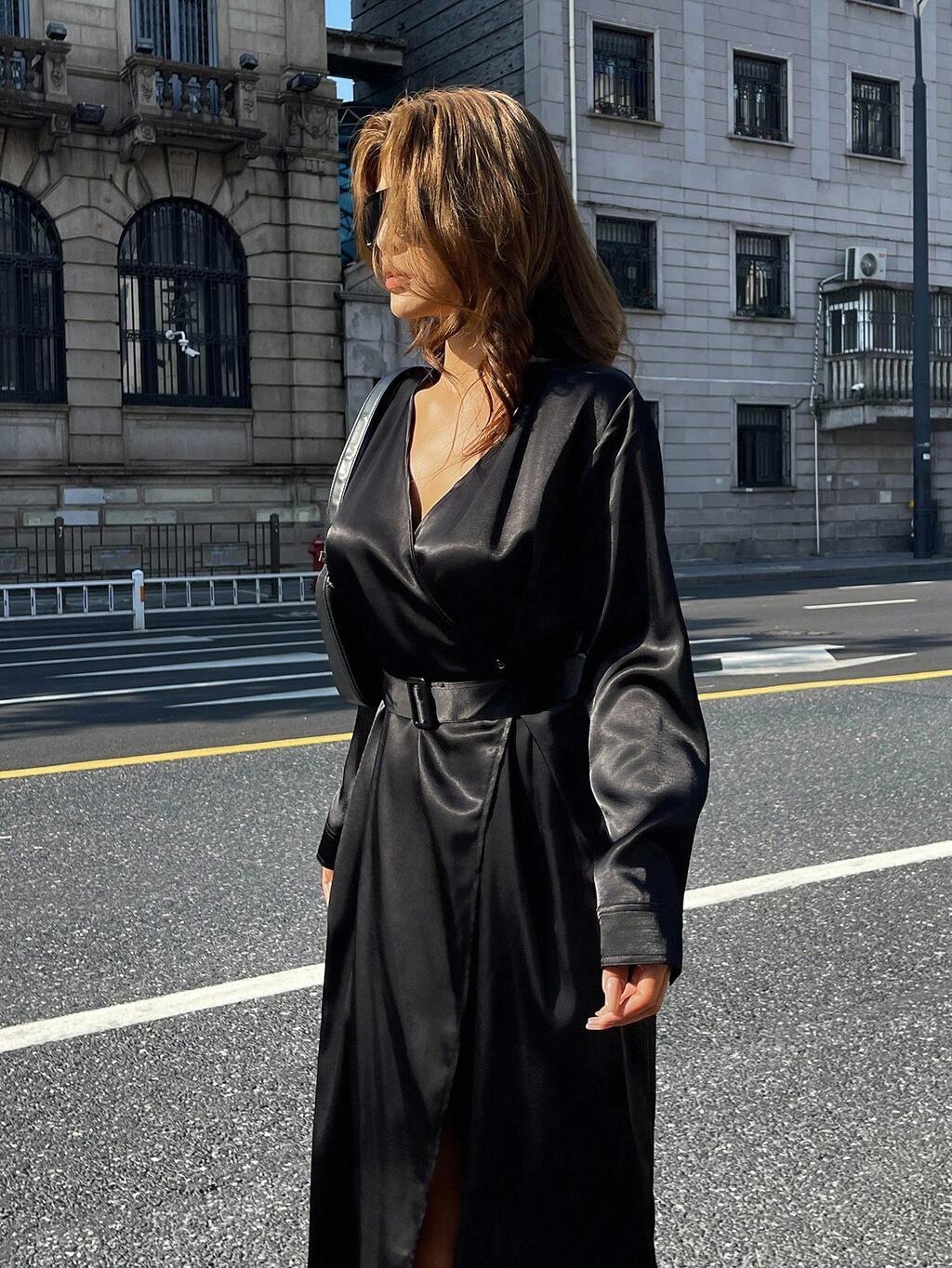Women's V-Neck Satin Collar Waist Cinched Long Dress, Autumn/Winter Maxi Dress