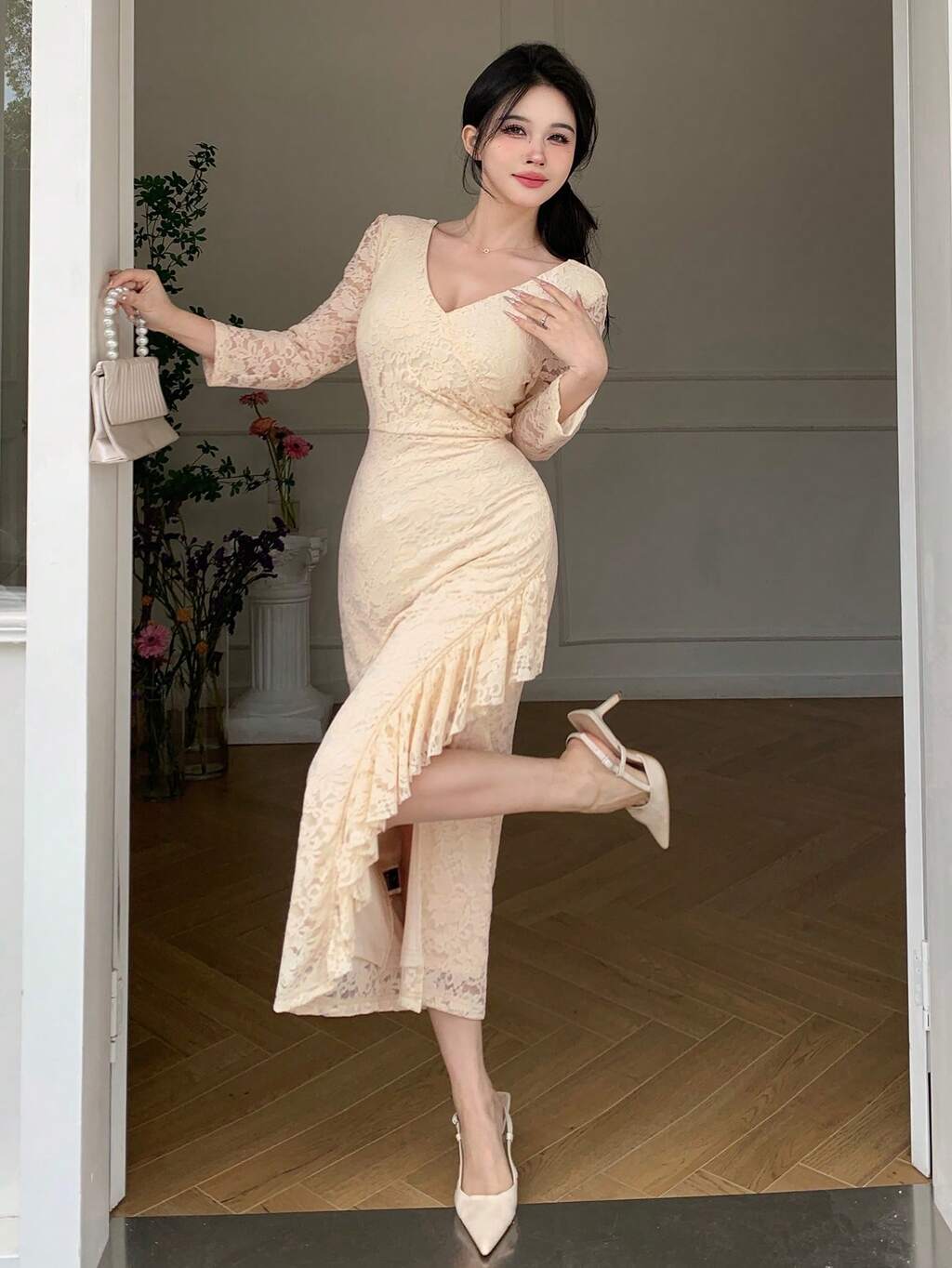 Vestido de cóctel midi ajustado y sexy con parches de encaje transparente, detalle de cordones y escote en V profundo, elegante vestido largo de manga larga para otoño