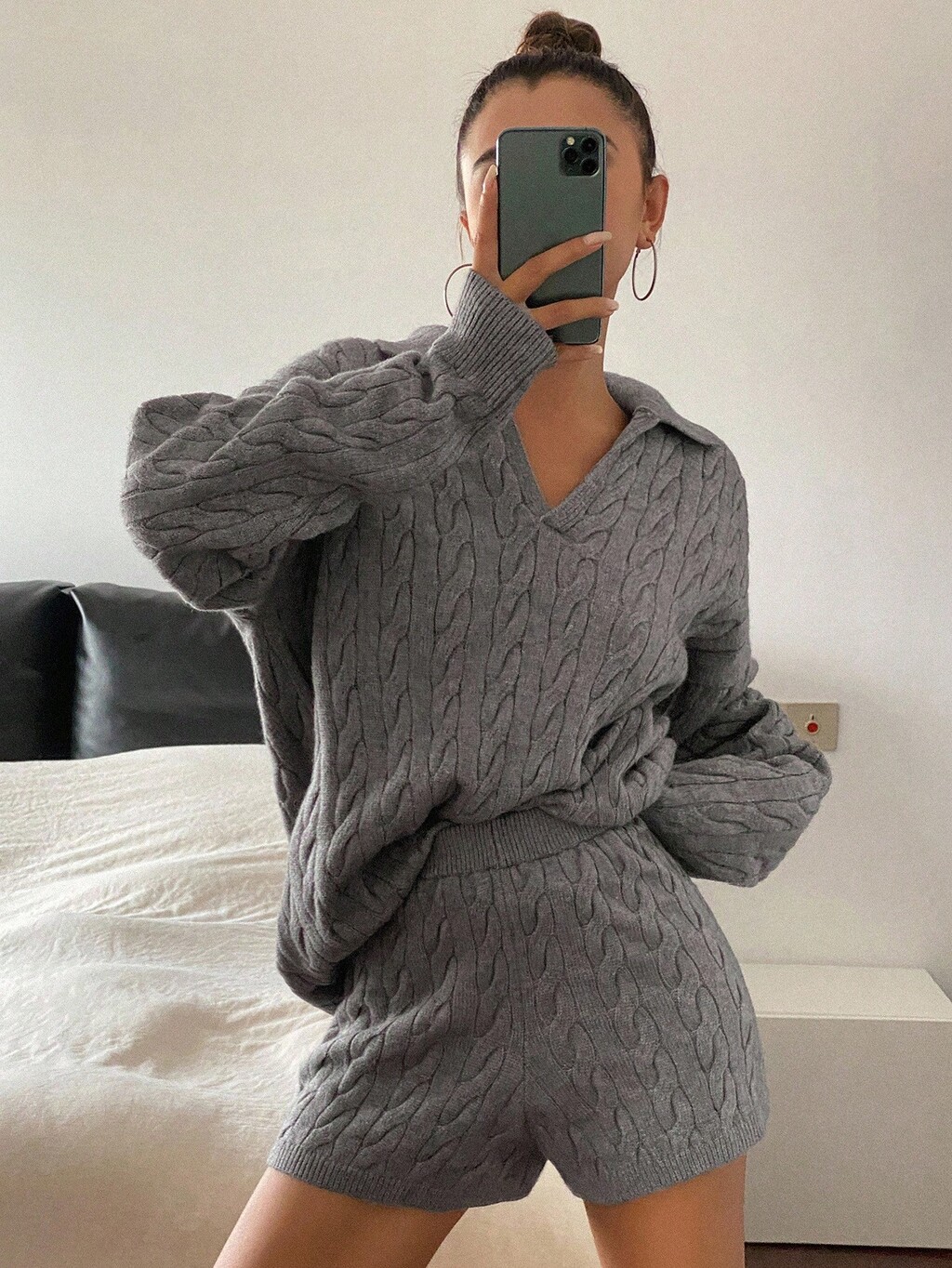 2pcs Women Contrast Color Patchwork V-Neck Loose Sweater Shorts Set, Black, Spring/Autumn,Fall Women Clothes