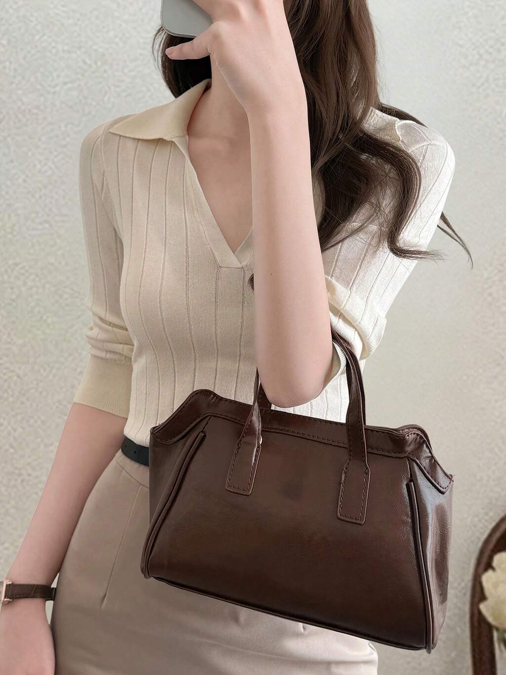 Niche Design Turndown Collar Fitted Mid-Sleeve Knit Sweater, Women's Fitted Knit Top