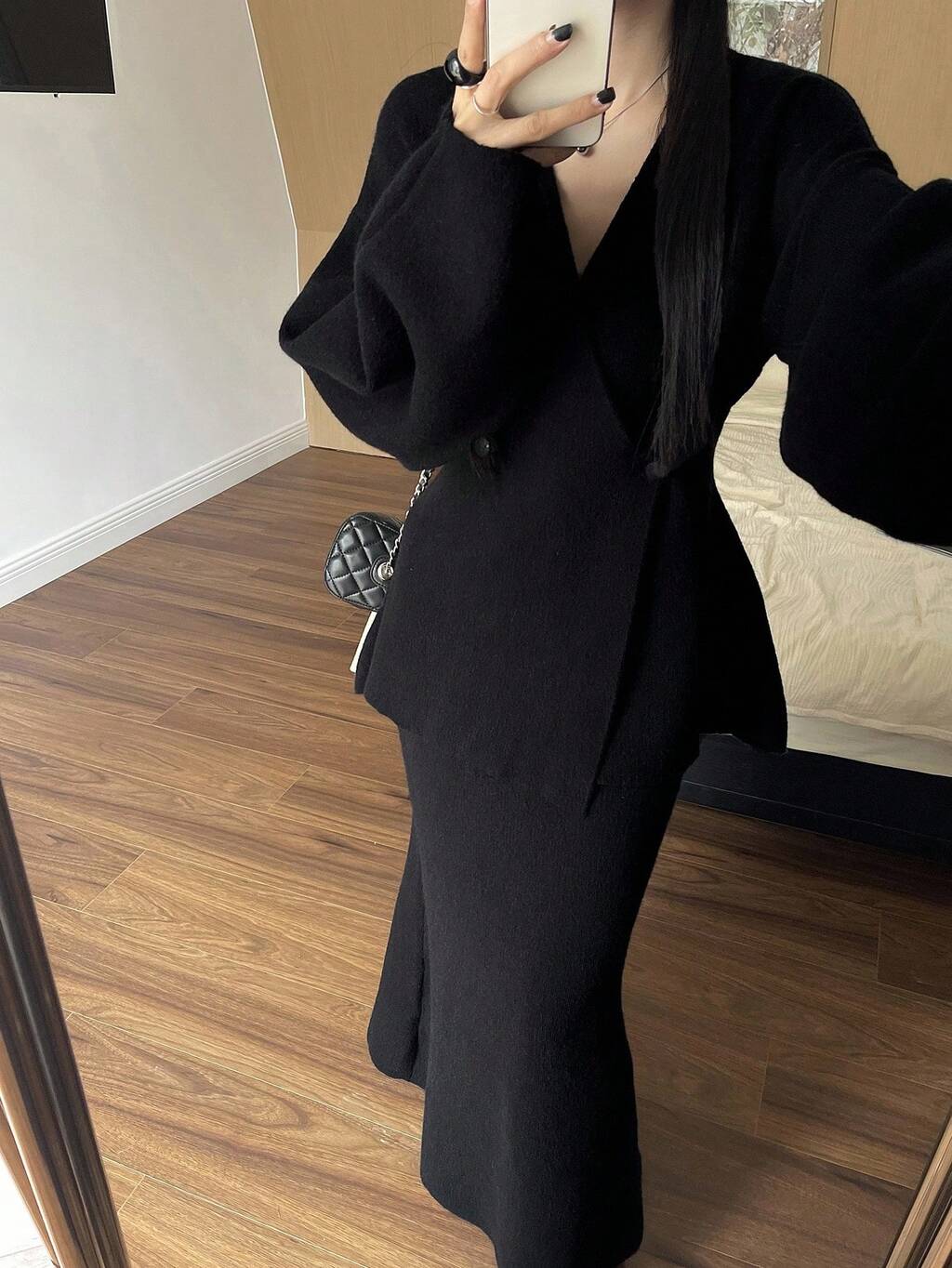 Women's Contrast Color Cardigan And Skirt Knit 2 Pieces Set