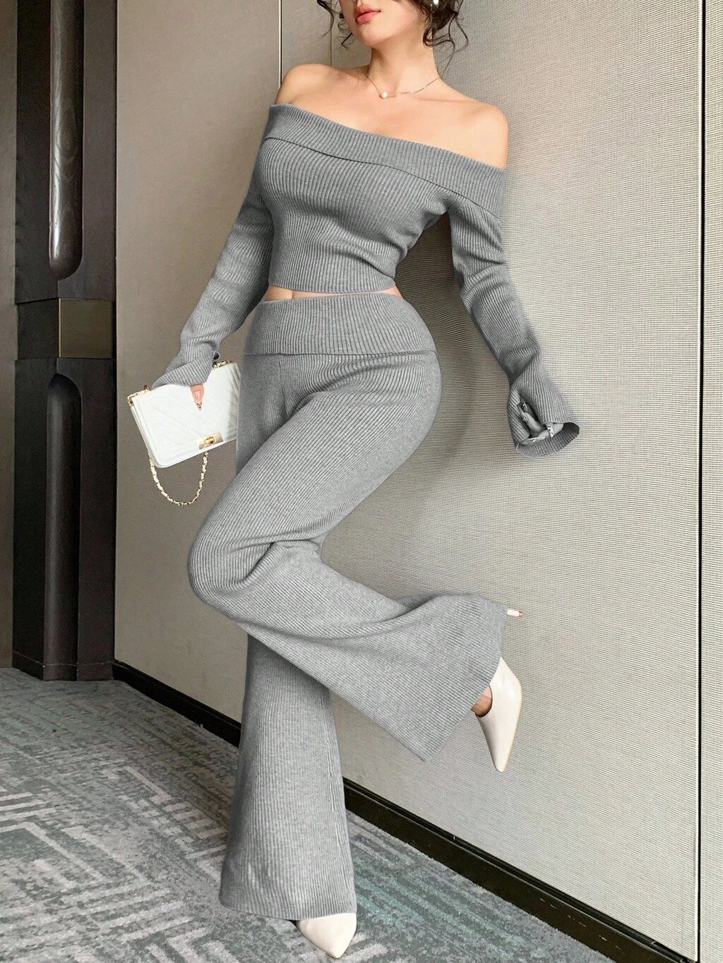 Women's Casual Solid Color Off Shoulder Sweater & Pants 2 Pieces Set, Autumn