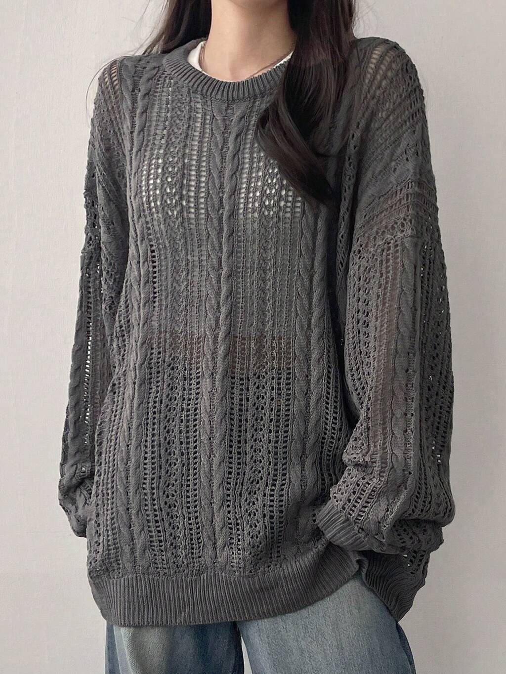 Women's Solid Color Minimalist Casual Long Sleeve Loose Hollow-Out Sweater,Fall Clothes