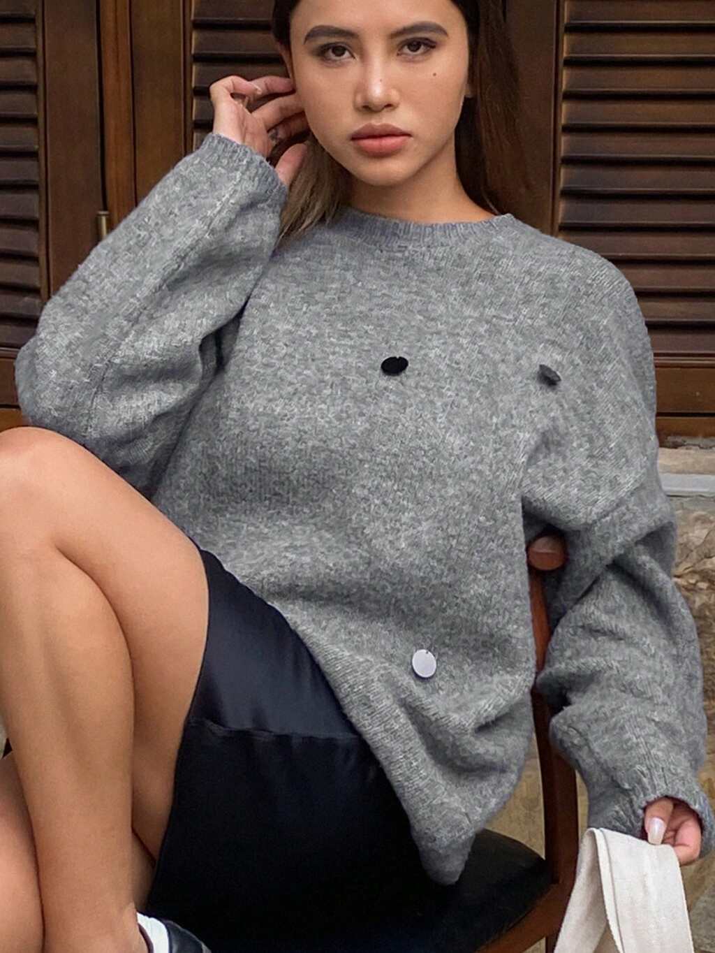 1pc Women Solid Color Polka Dot Loose Fit Crew Neck Long Sleeve Sweater,Fall Women Clothes