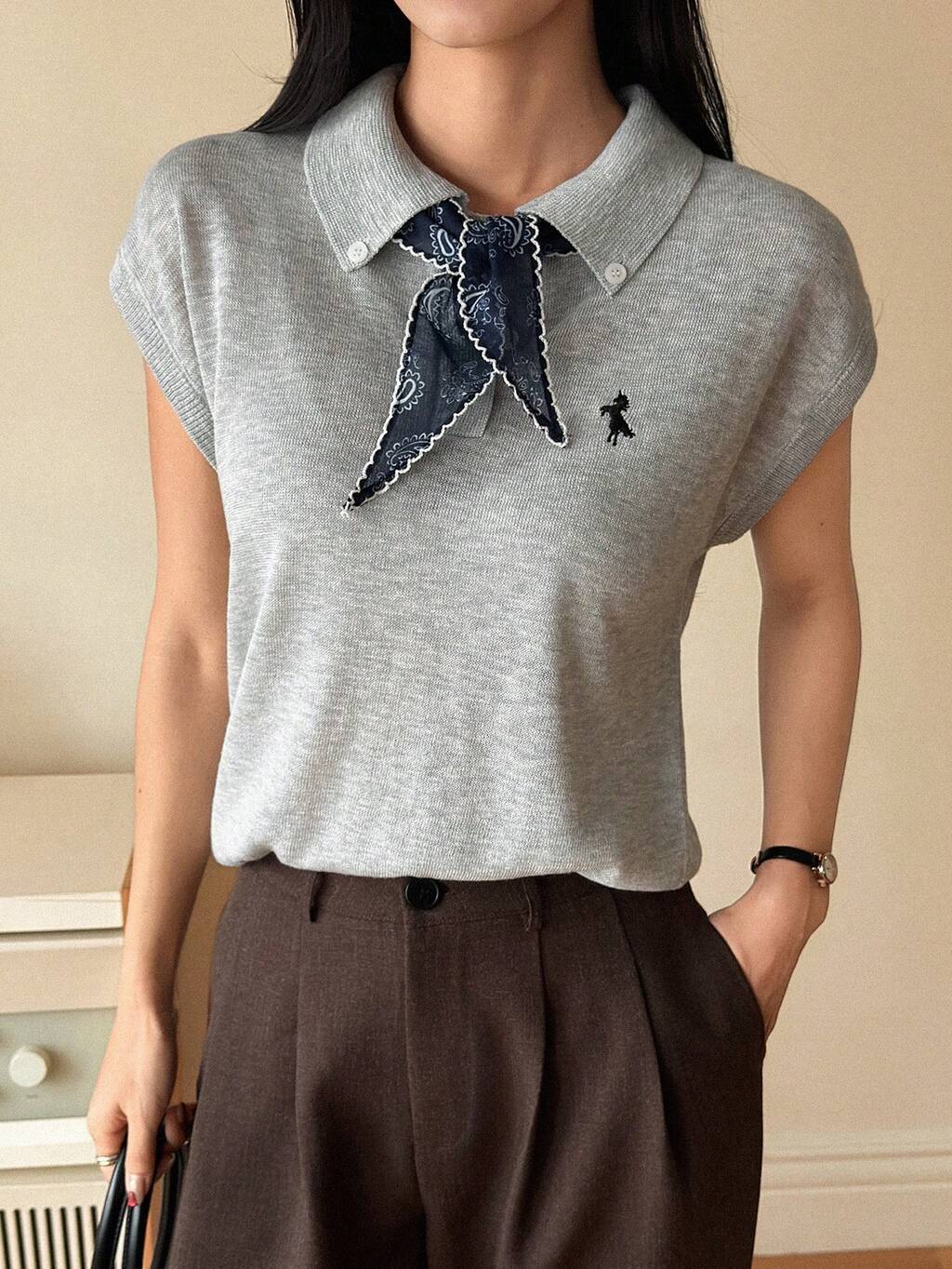 Women's Collared Short Sleeve Knit Top With Scarf Patchwork, Casual City Style Summer