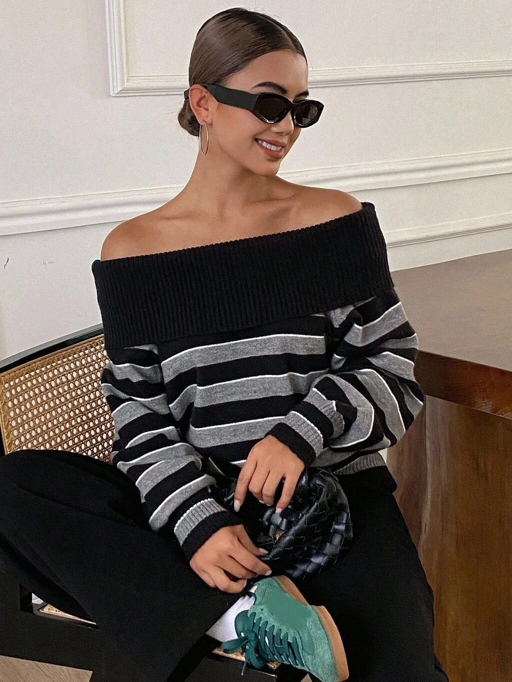 Contrast Stripe Off Shoulder Loose Long Sleeve Casual Street Knit Sweater For Women, Autumn/Winter