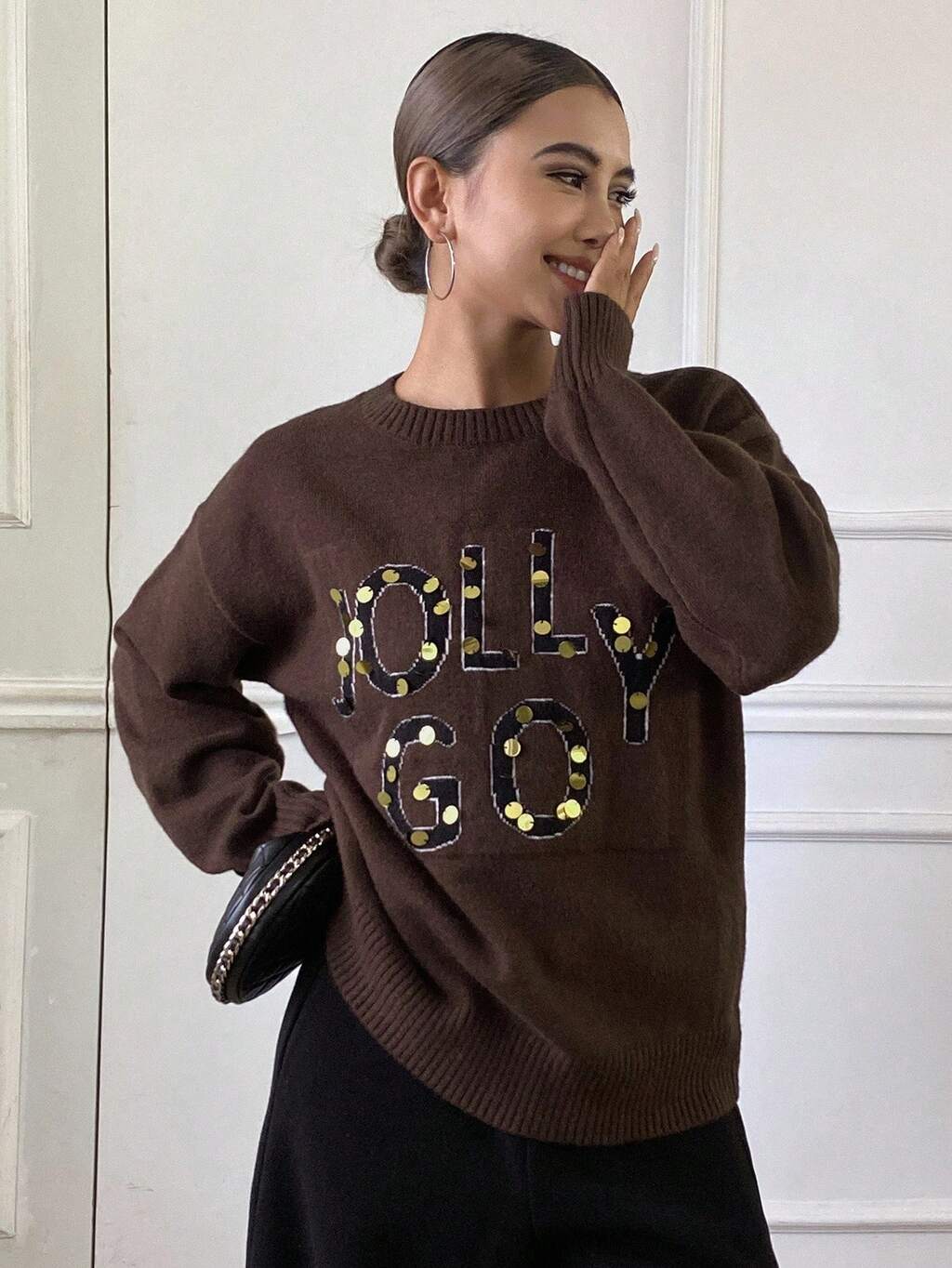 Sequin Letter Jacquard Loose Fit Casual Street Style Crew Neck Long Sleeve Knit Sweater For Women, Autumn/Winter
