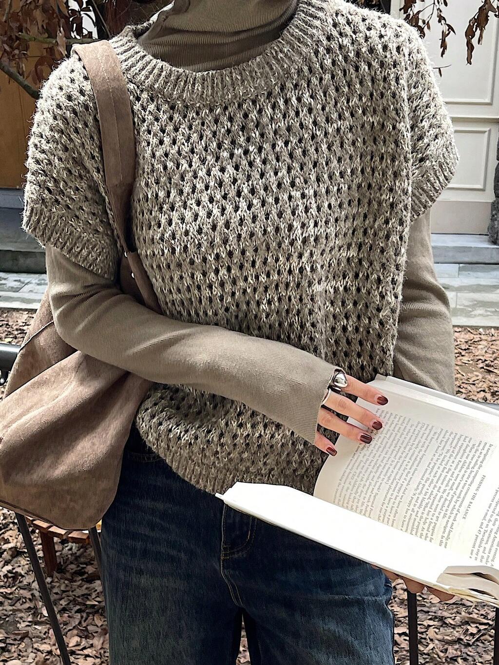 Women's Loose Business Casual Elegant Round Neck Knit Sweater Vest Two Pieces Set, Autumn/Winter