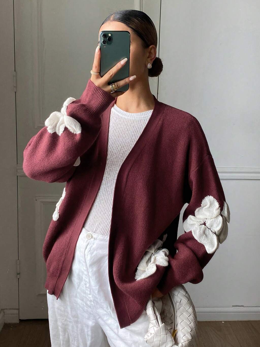 Women's Elegant Contrast Color Floral Cardigan, Autumn