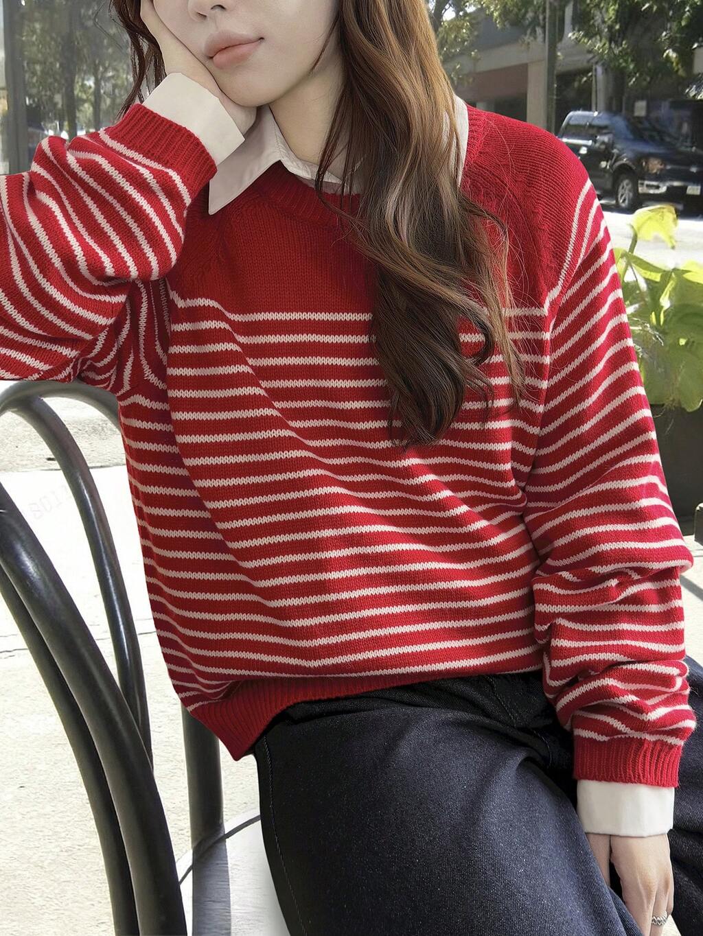 Women's Striped Round Neck Long Sleeve Sweater, Korean Style