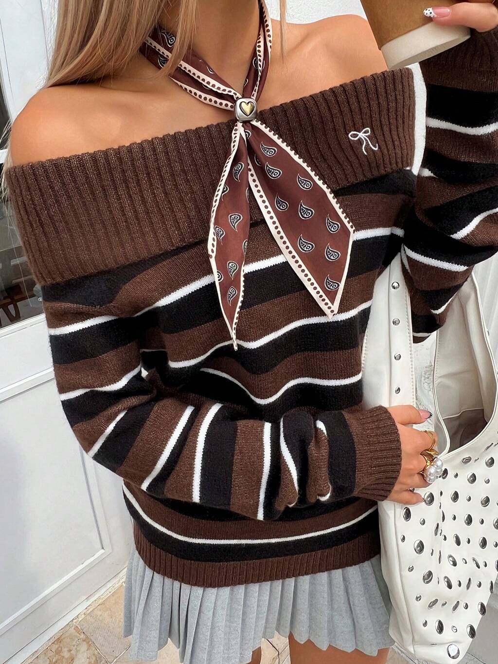 Women's Off-Shoulder Striped Pullover Casual Sweater, Urban Chic Style, Autumn/Winter