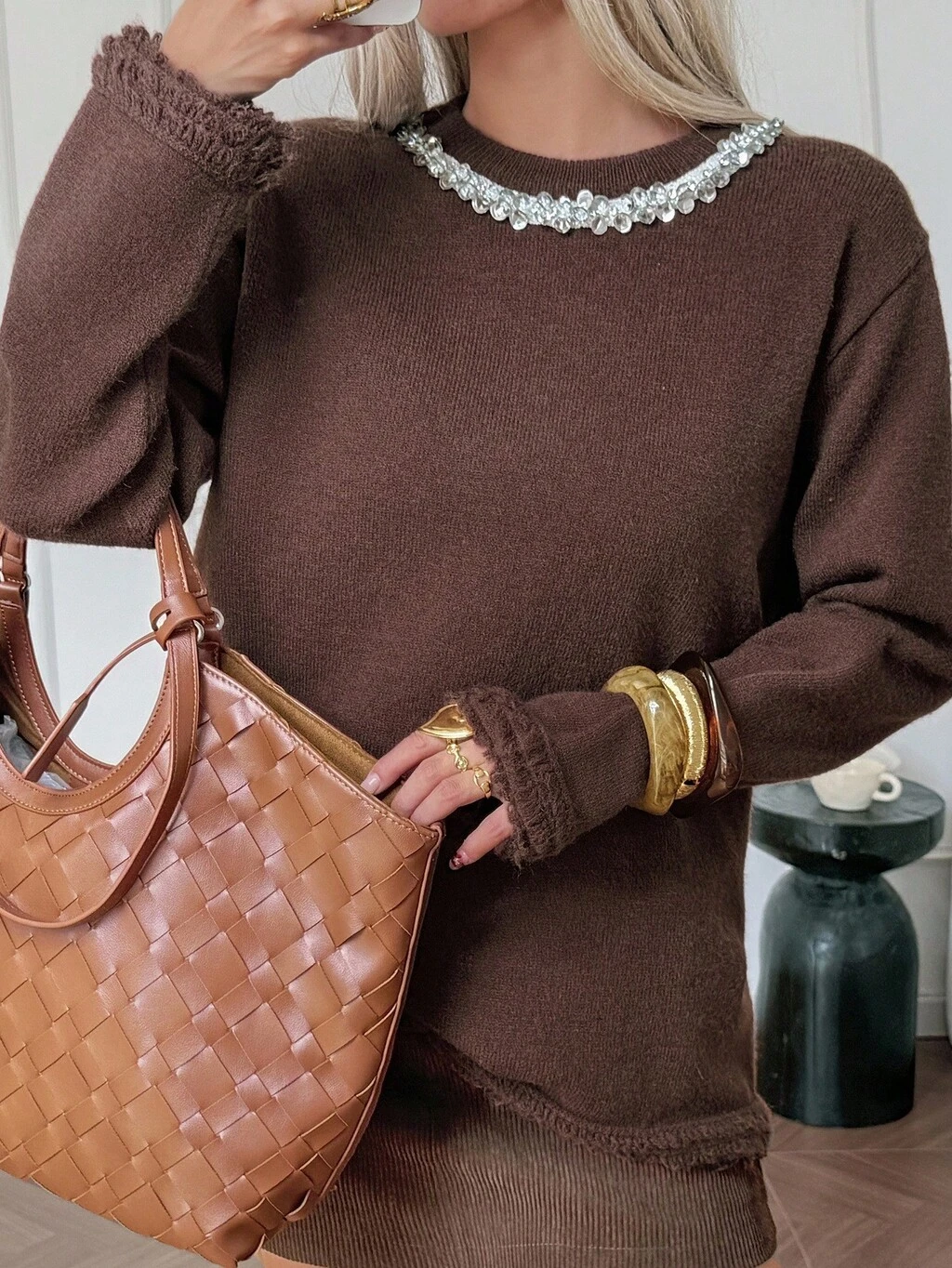 Women's Loose Business Casual Floral Embroidery Beaded Sequin Shiny Knit Sweater, Suitable For Wedding, Party, Fashion, Autumn/Winter Modest Fashion