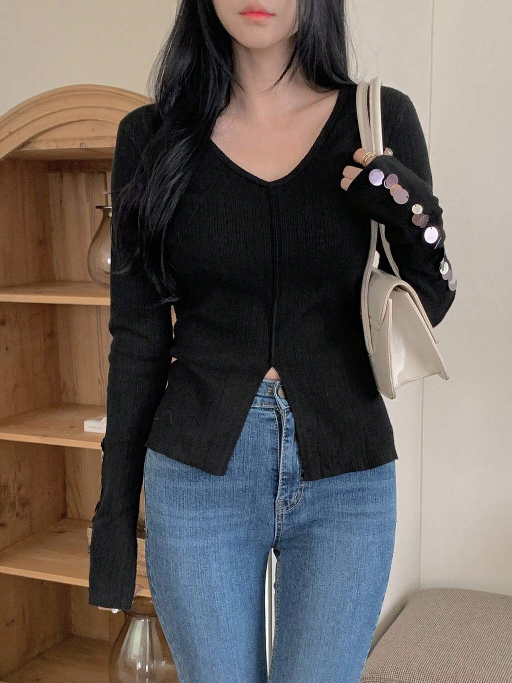 Solid Color Fitted V-Neck Long Sleeve Slit Sequin Decor Elegant Sweater For Women, Autumn/Winter