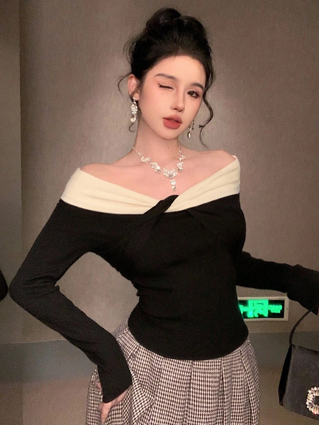 Women's Contrast Color One-Shoulder Sweater, Autumn Off Shoulder Top