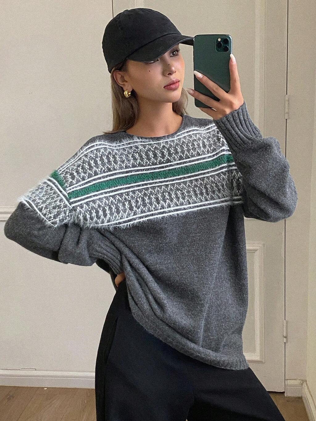Women's Contrast Color Vintage Jacquard Loose Crew Neck Long Sleeve Casual Street Style Knit Sweater, Autumn/Winter