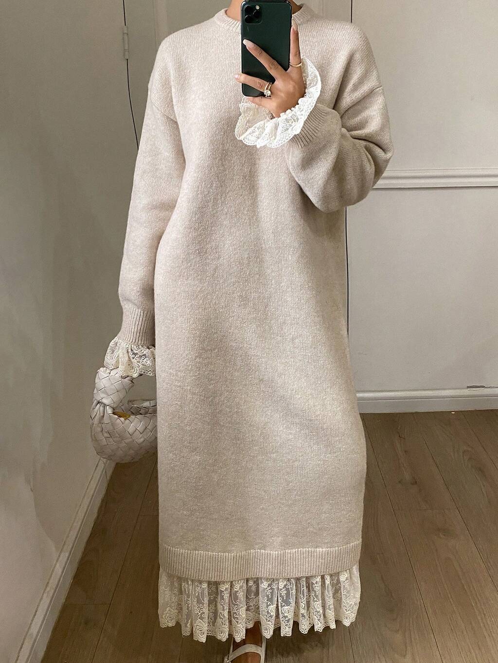 Casual Long Sweater Dress For Women Elegant Plain Apricot Knitwear With Ruffle Hem Long Length Raglan Sleeve
