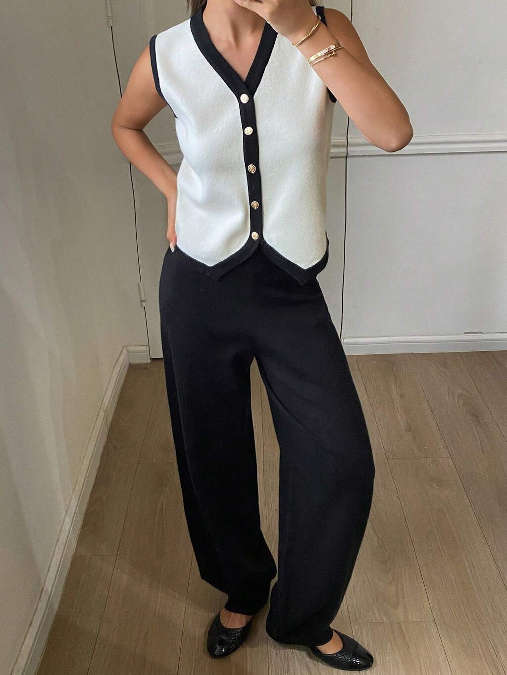 2pcs Women Casual Contrast Color Vest And Pants Knitted Sweater Set, Autumn