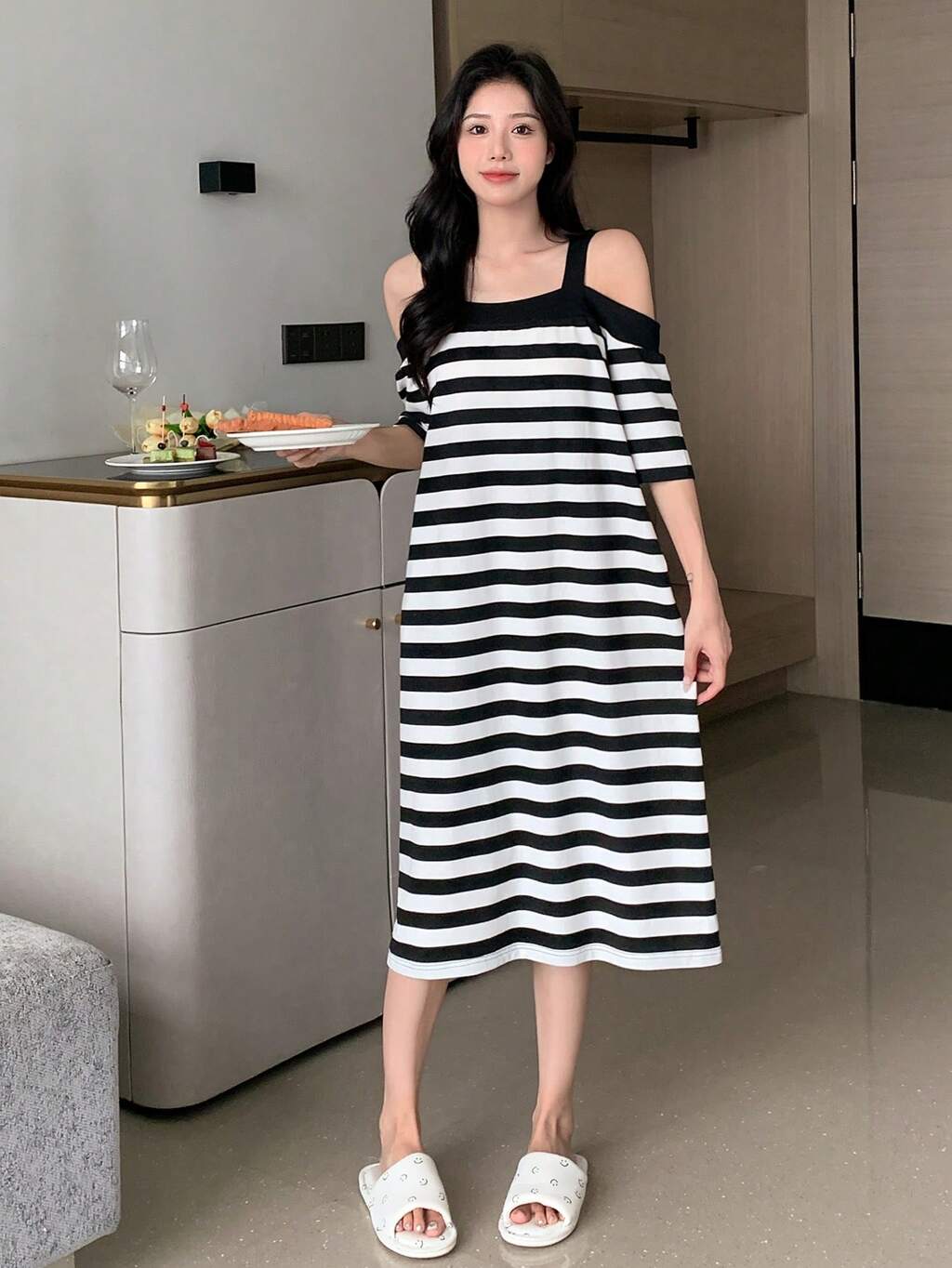 Striped Cold Shoulder Lounge Dress, Moo Moo Pajama