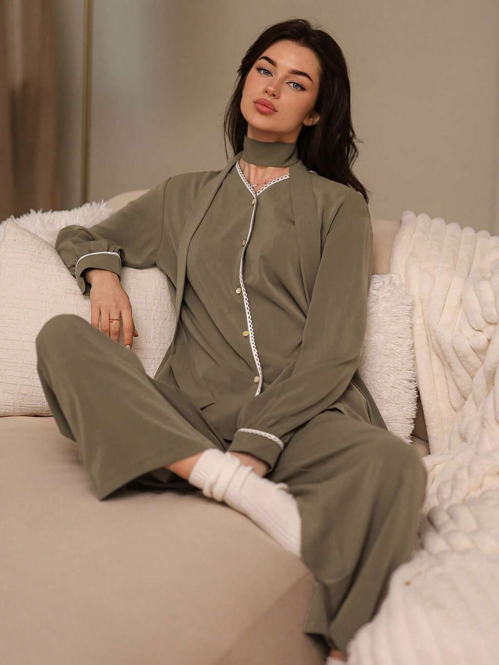 3pcs Set Knitted Lace Pearl Button Decor Camisole, Robe & Pants Women Sleepwear Suit, Autumn/Winter
