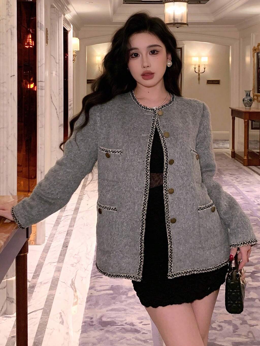 Damska krótka kurtka w jednolitym kolorze z kieszeniami i zapięciem na guziki z przodu, długi rękaw, jesienna odzież damska, płaszcze damskie