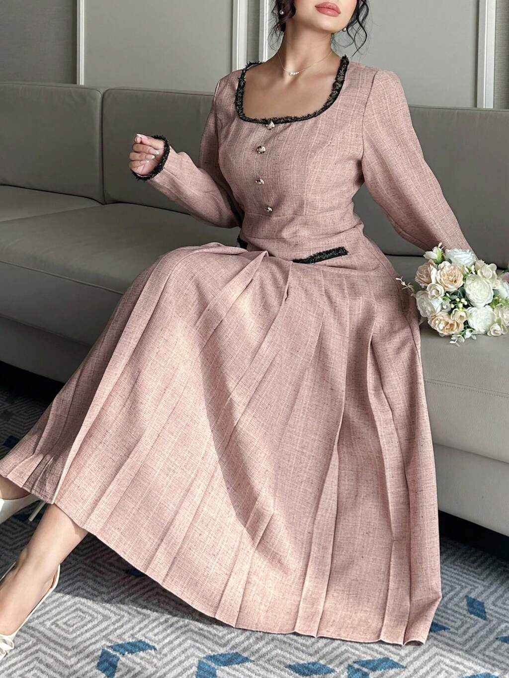 Dazy Plus Elegant Pleated Waist Crew Neck Long Sleeve Blouse, Fashionable Poplin Fabric, Suitable For Spring And Autumn