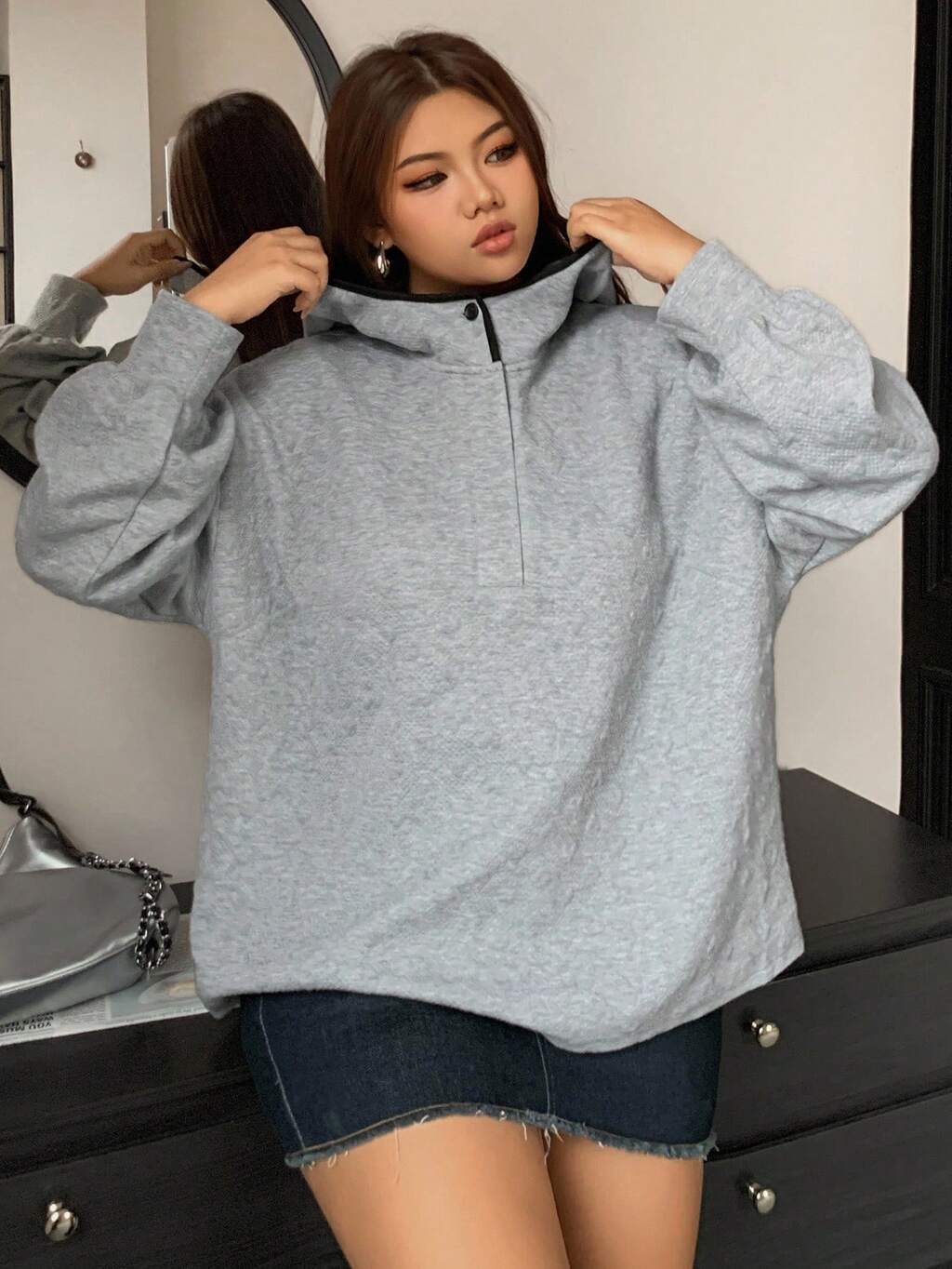 Dazy Plus Plus Size Textured Fabric Loose Fit Hooded Long Sleeve Pullover Sweatshirt, Casual Plus Size Women, Autumn/Winter
