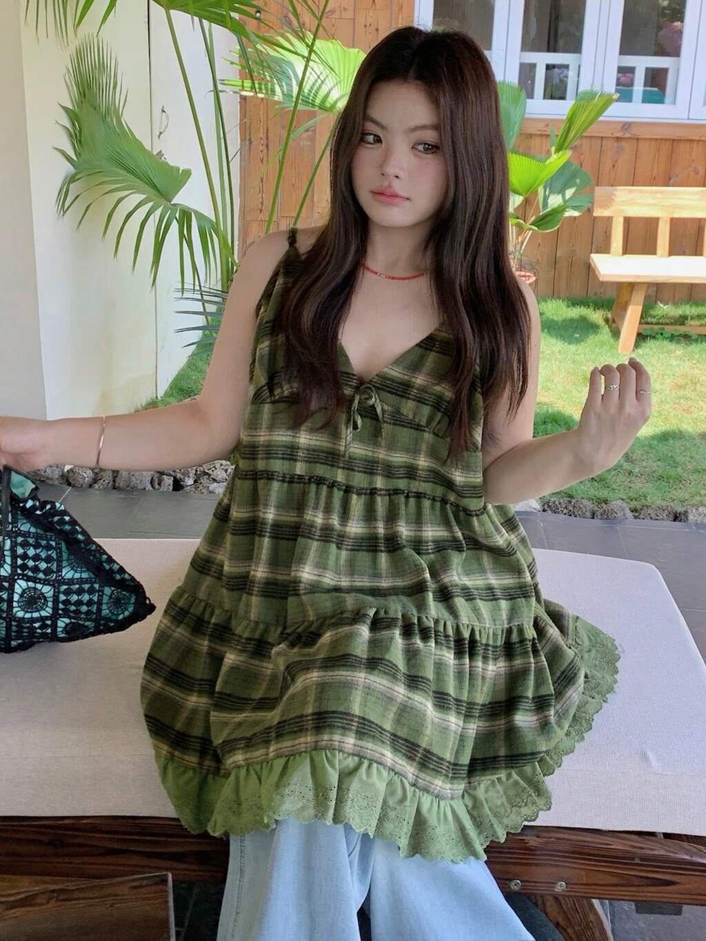 Dazy Plus Plaid Strap Patchwork Embroidered Cotton Fabric Front Bow Decor Layered Casual Loose Versatile Camisole Tank Top, Autumn/Winter, Plus Size