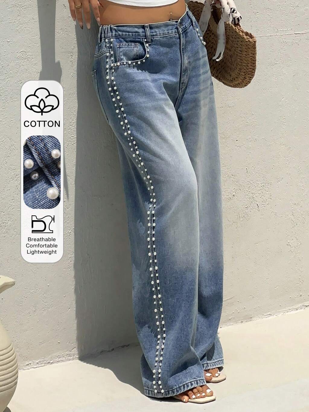 Dazy Plus Regular Waist Pearl Beaded Loose Straight Leg Jeans, Casual City Style Plus Size Women Spring/Summer