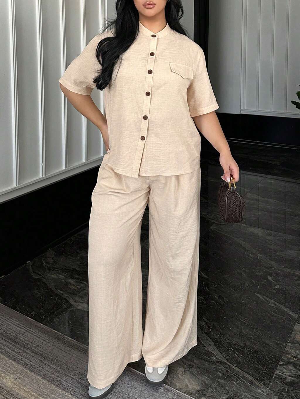 Dazy Plus 2pcs/Set Casual Round Neck Loose Pocket Decor Short Sleeve Shirt Top And Wide Leg Pants Plus Size Women Spring/Summer Lounge Sets For Women