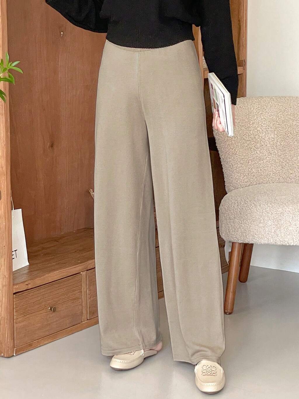 1pc Women Solid Color Wide Leg Knitted Pants, Suitable For Autumn/Winter