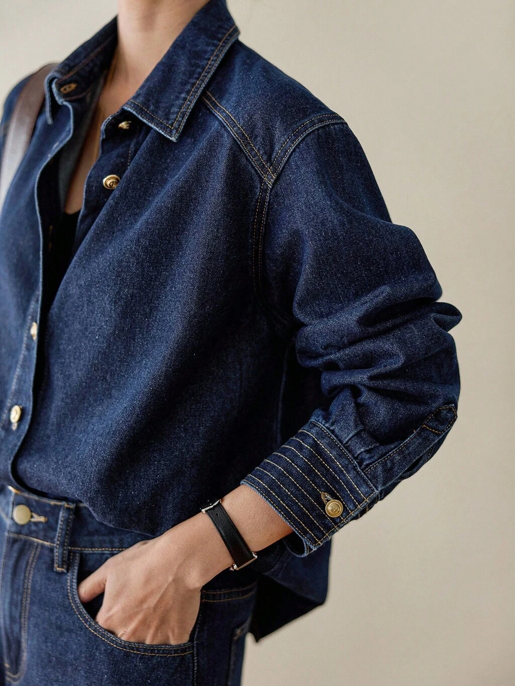 2-częściowy damski luźny, swobodny, biznesowy strój dżinsowy, vintage, sprane, jednokolorowe jeansy z prostymi nogawkami, kurtka i spodnie z kontrastowymi przeszyciami, jesienno-zimowe ubrania damskie