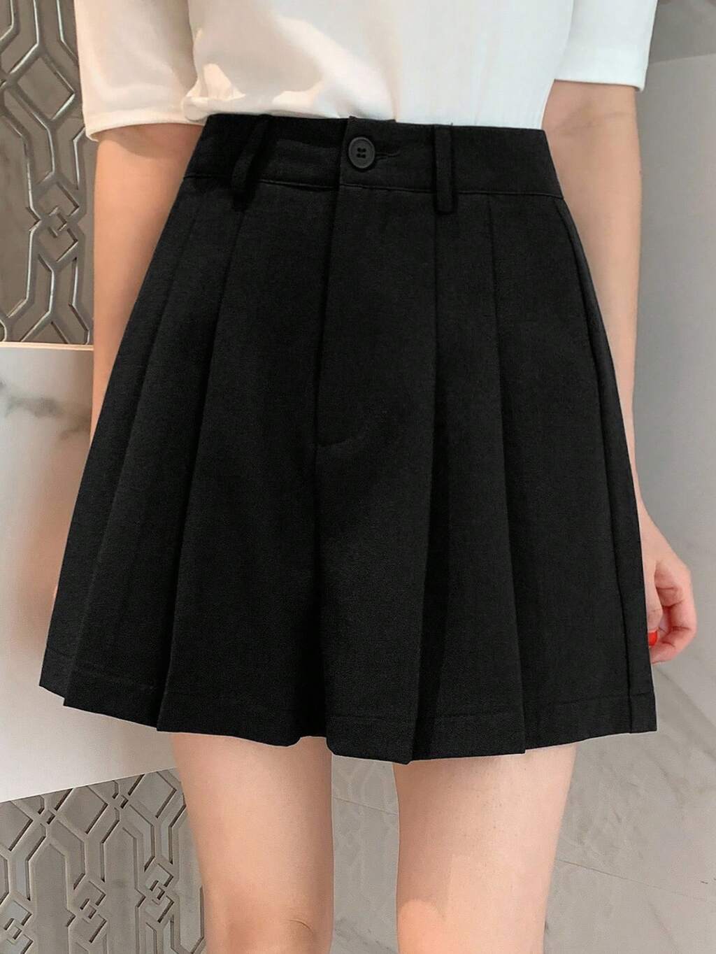 Black Pleated A-Line Women's Shorts With Button Detail, Minimalist Casual Academic Style