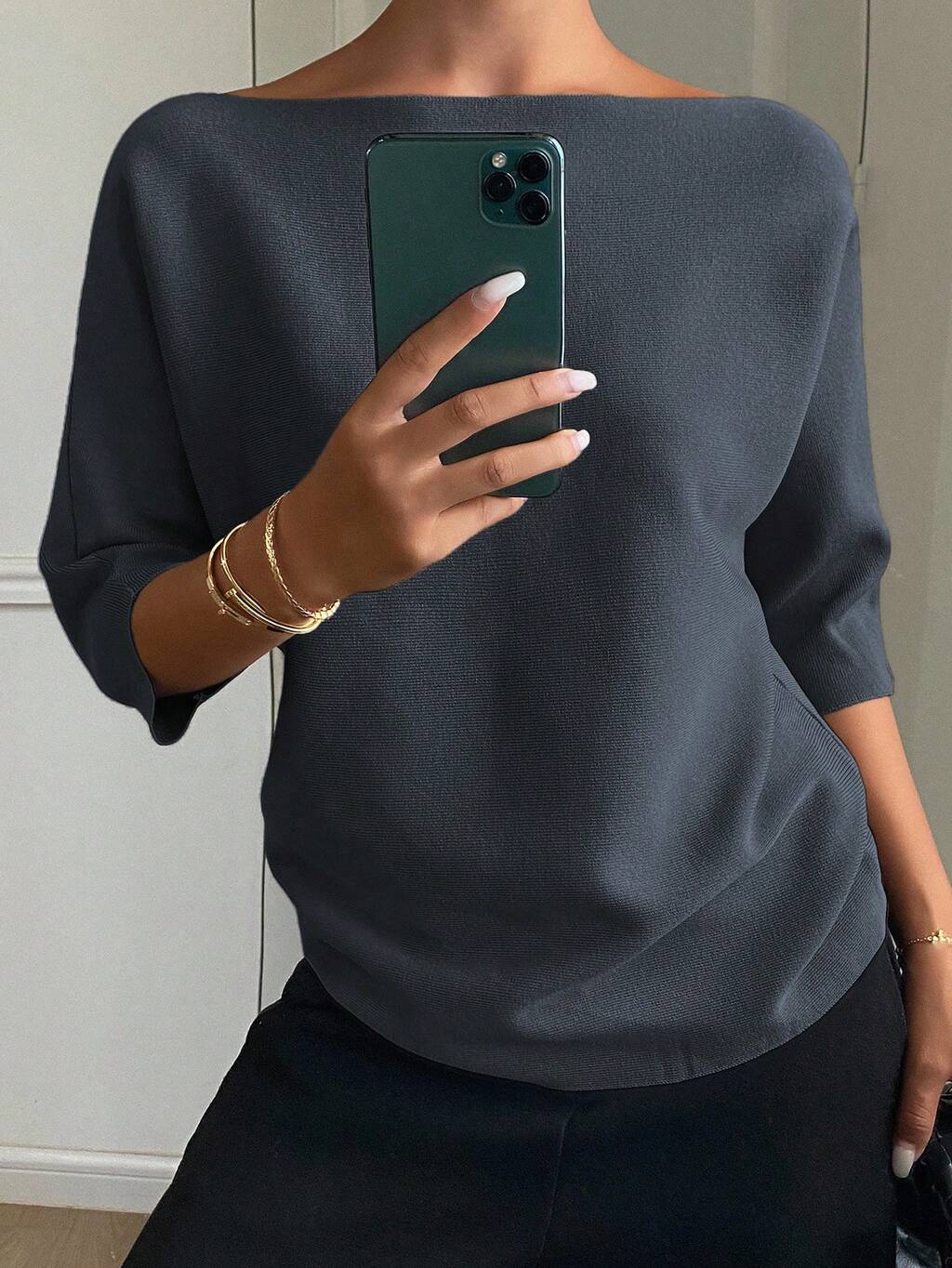 Women's Solid Color Fitted Boat Neck Half Sleeve Casual Elegant Knit Top, Autumn/Winter
