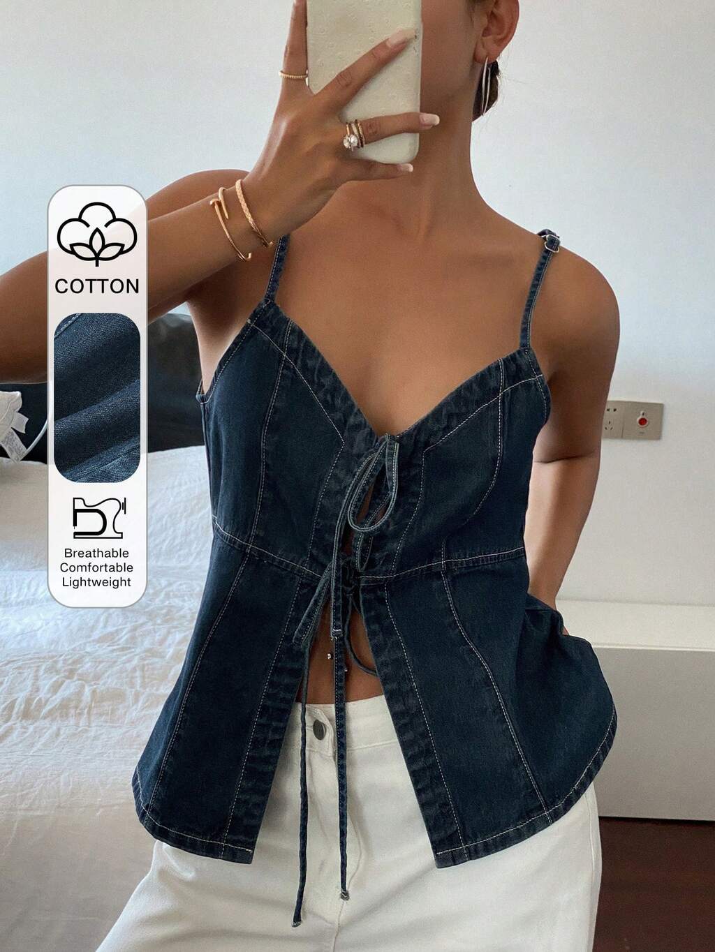 Women's Summer Spaghetti Strap Denim Camisole With Bow Tie, Casual Denim Top