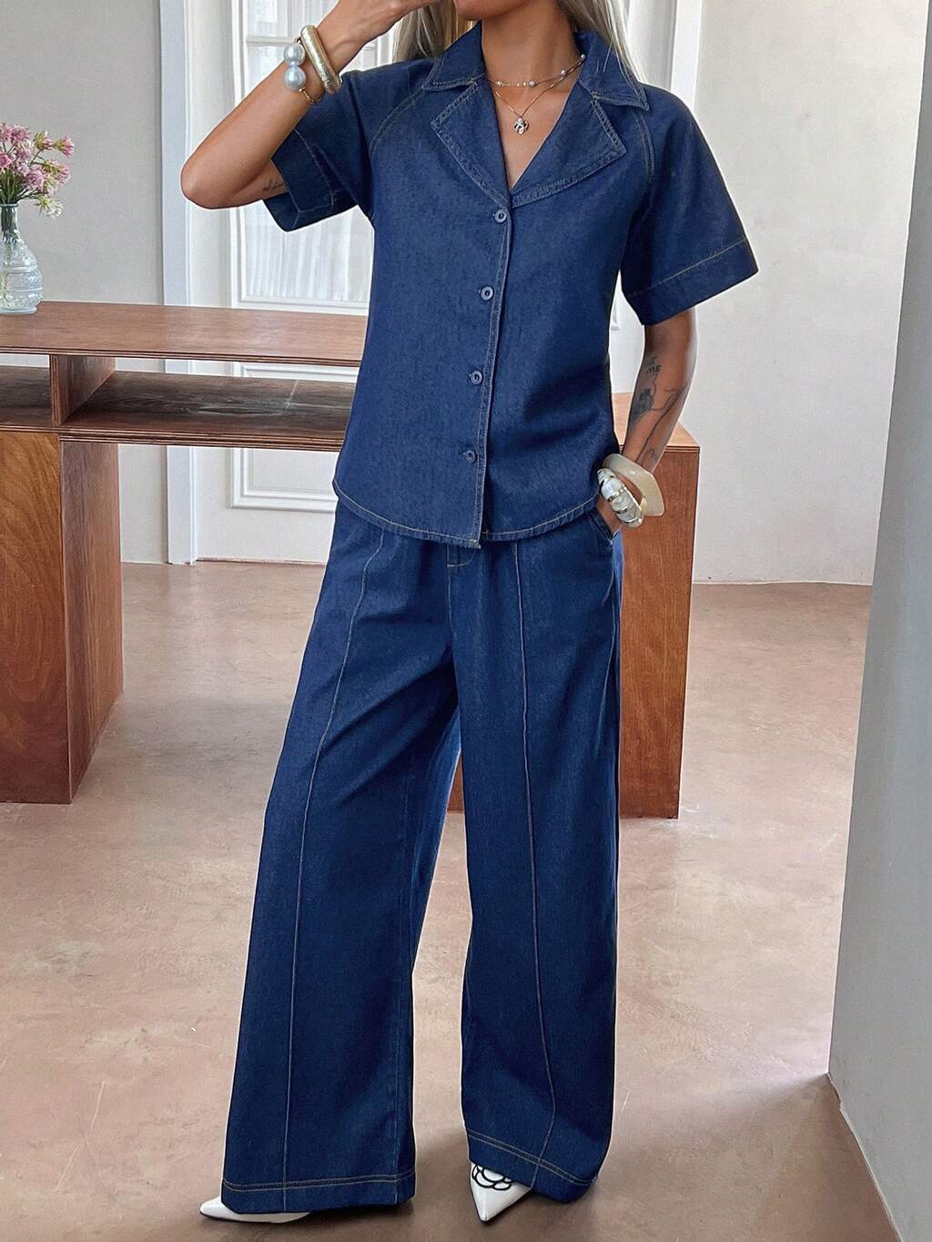 Women's Short Sleeve Top And Denim Pants Set
