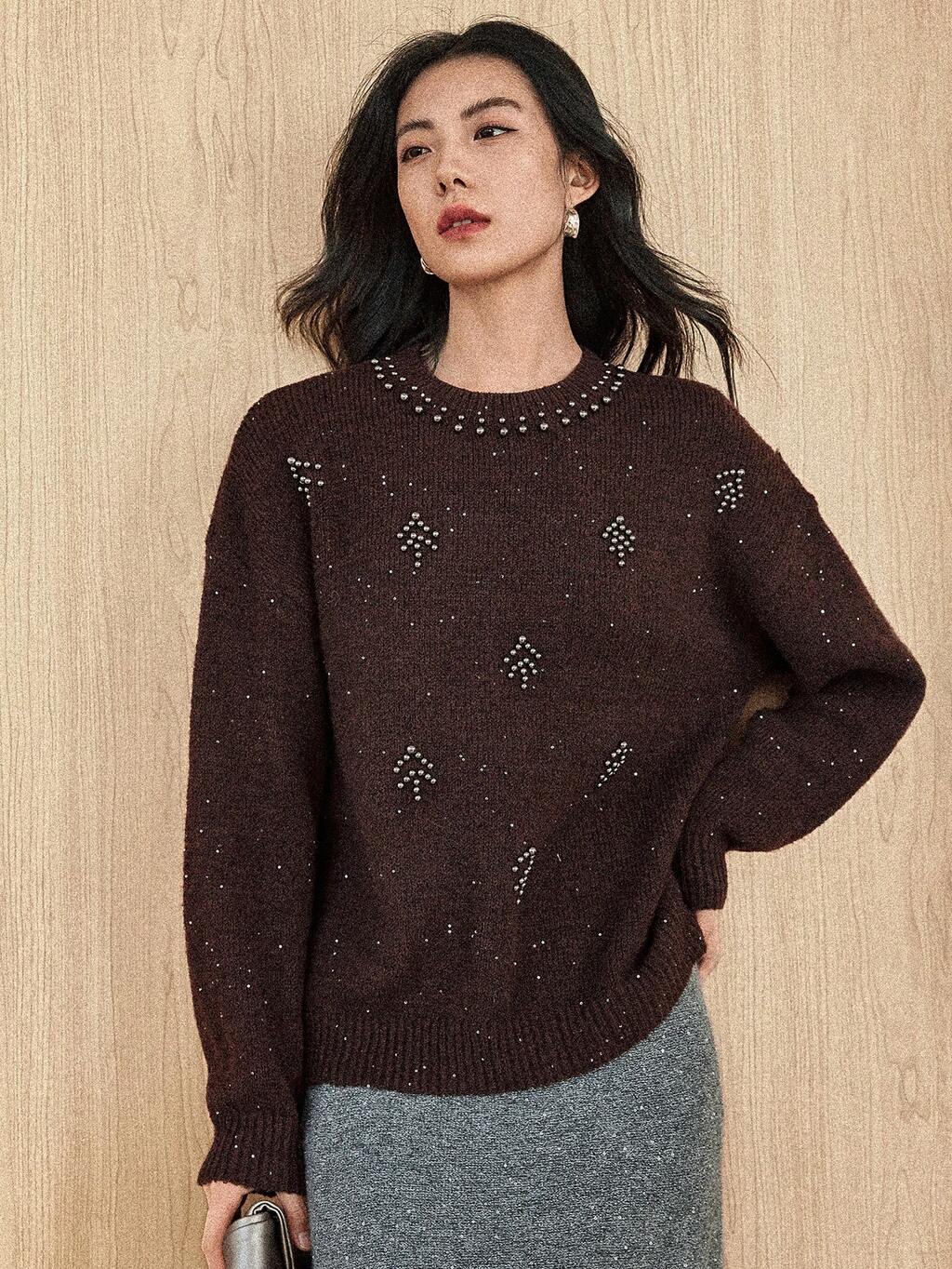 Women's Loose Business Casual Crew Neck Beaded Knit Sweater, Brown, Suitable For Autumn And Winter