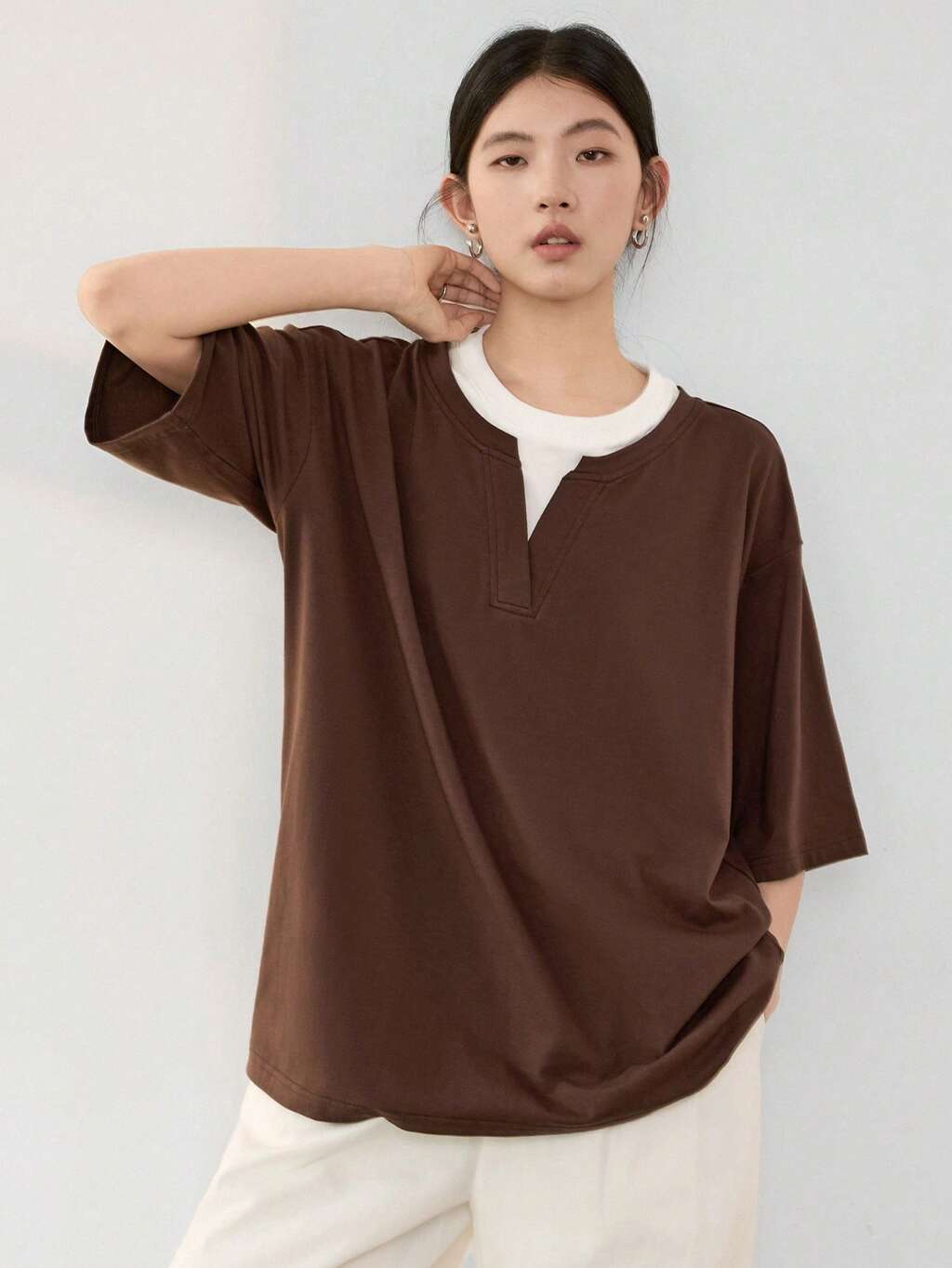 Casual Loose Contrast Color Splice 2 In 1 V-Neck Short Sleeve T-Shirt For Women Summer Old Money Style Oversized T-Shirt, Teacher