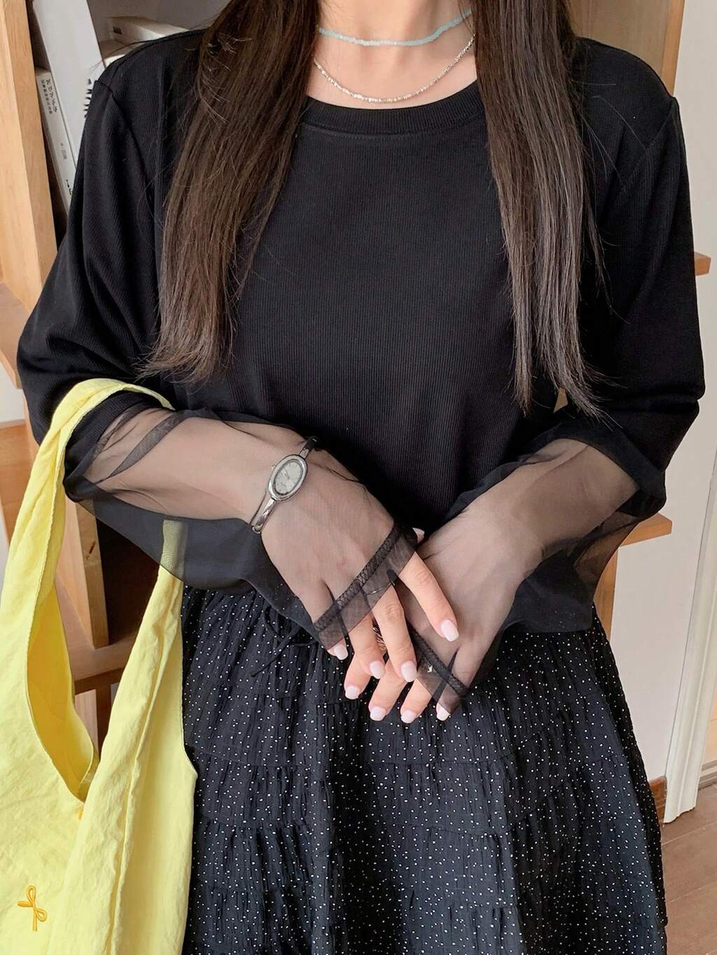 Dazy Plus Patchwork Contrast Color Mesh Sleeve Round Neck Long Sleeve Casual Loose Versatile Plus Size Women Black T-Shirt, Spring/Summer