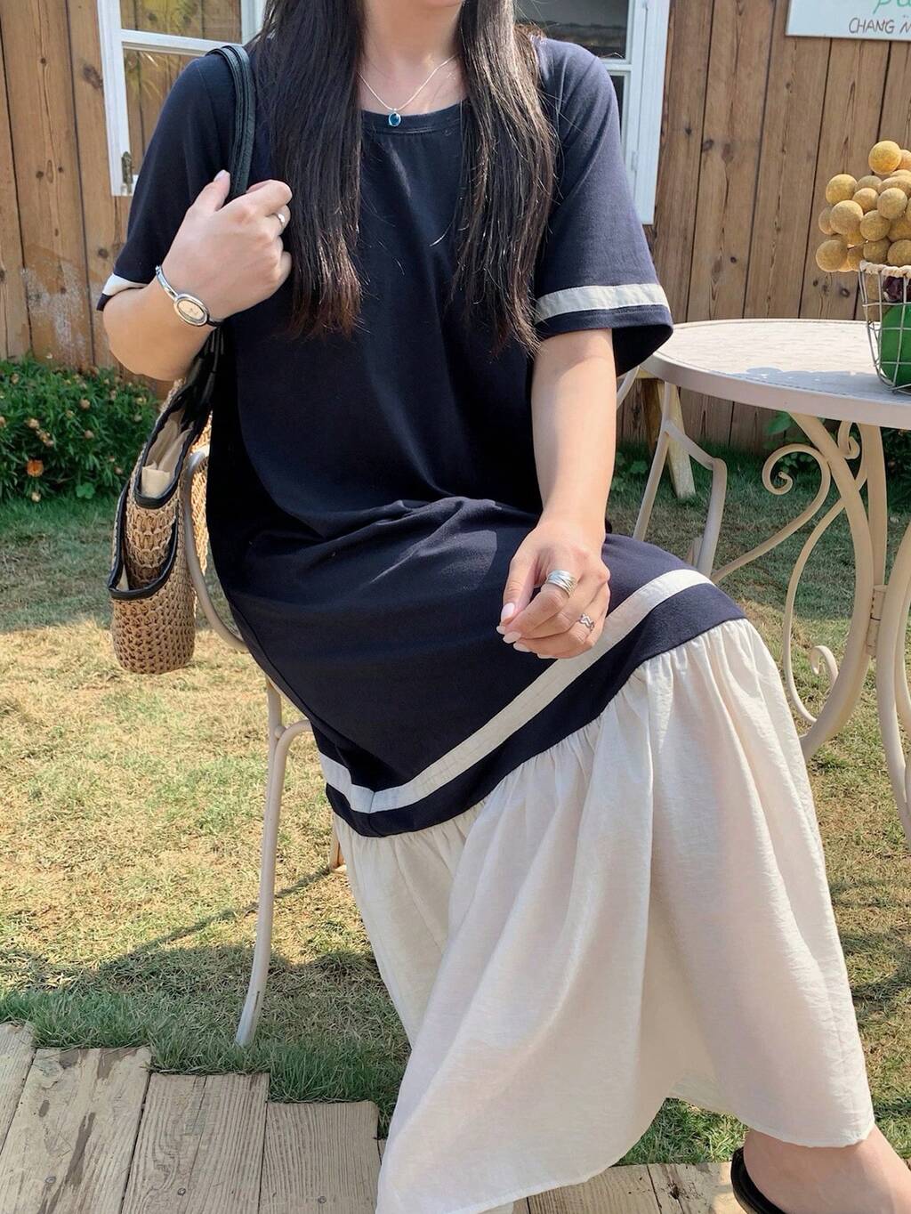 Dazy Plus Contrast Color Block Round Neck Casual Long Dress, College Style, Plus Size For Women, Spring/Summer