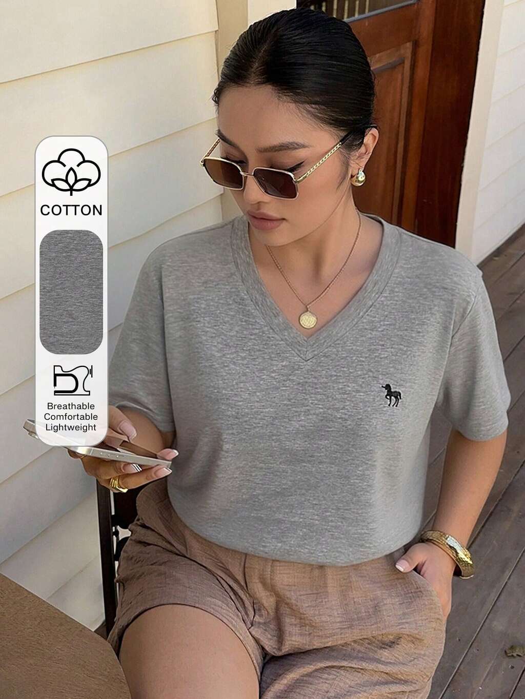Dazy Plus Embroidered Pattern V-Neck Loose White Short Sleeve T-Shirt