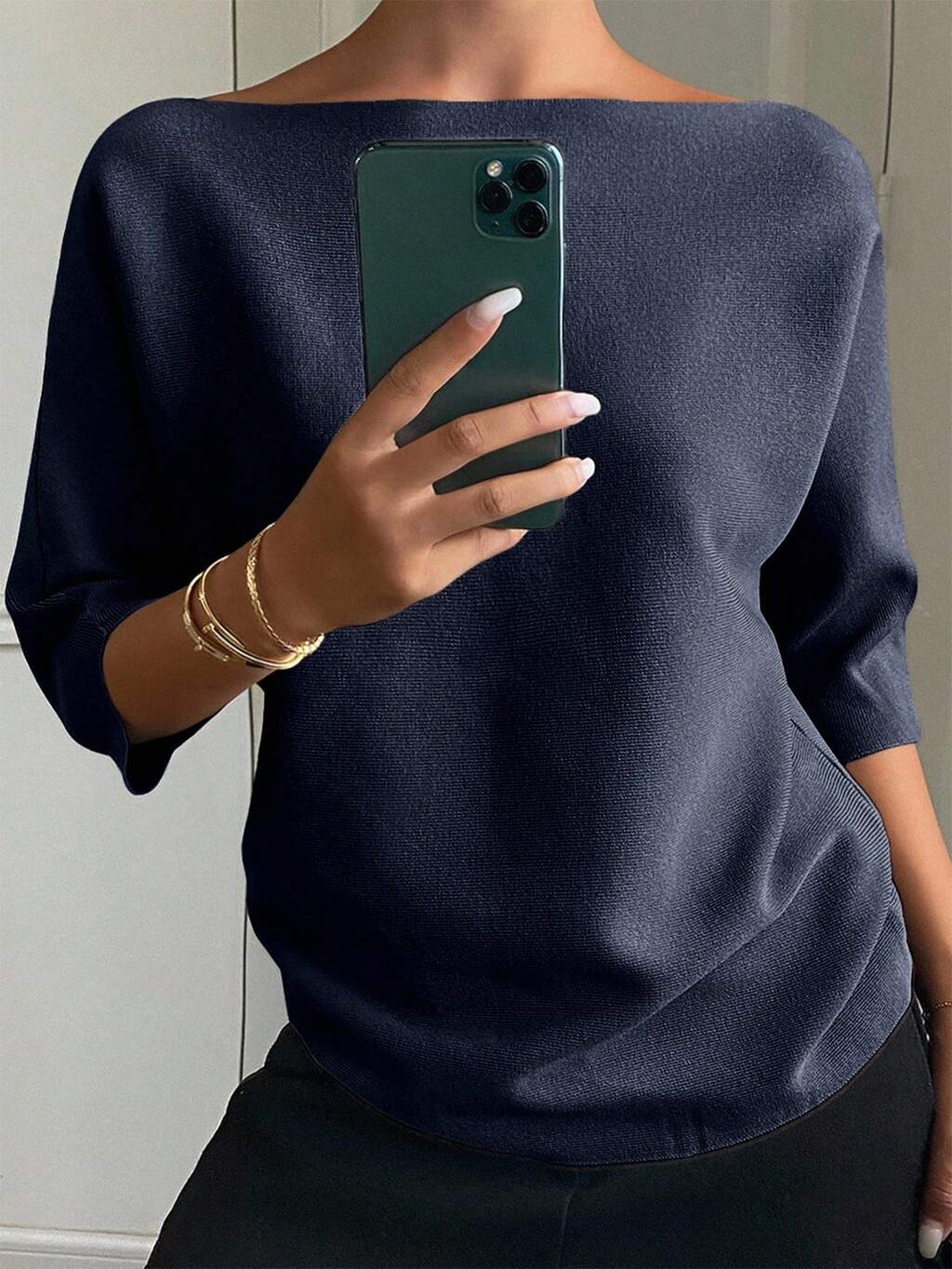 Women's Solid Color Fitted Boat Neck Half Sleeve Casual Elegant Knit Top, Autumn/Winter