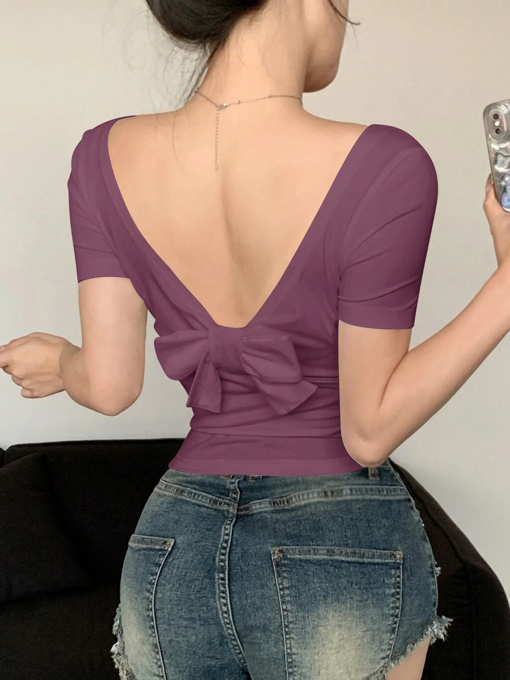 Women's Solid Color Bowknot Back Design Short Sleeve Fitted Fashion T-Shirt, Purple Top,Halter Top