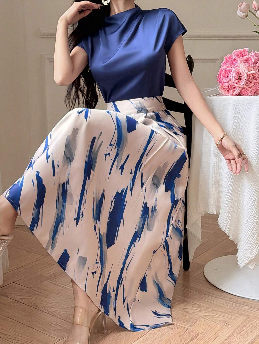 Women's Elegant Solid Color Draped Neck Top And Contrast Floral A-Line Skirt 2 Piece Set, Summer