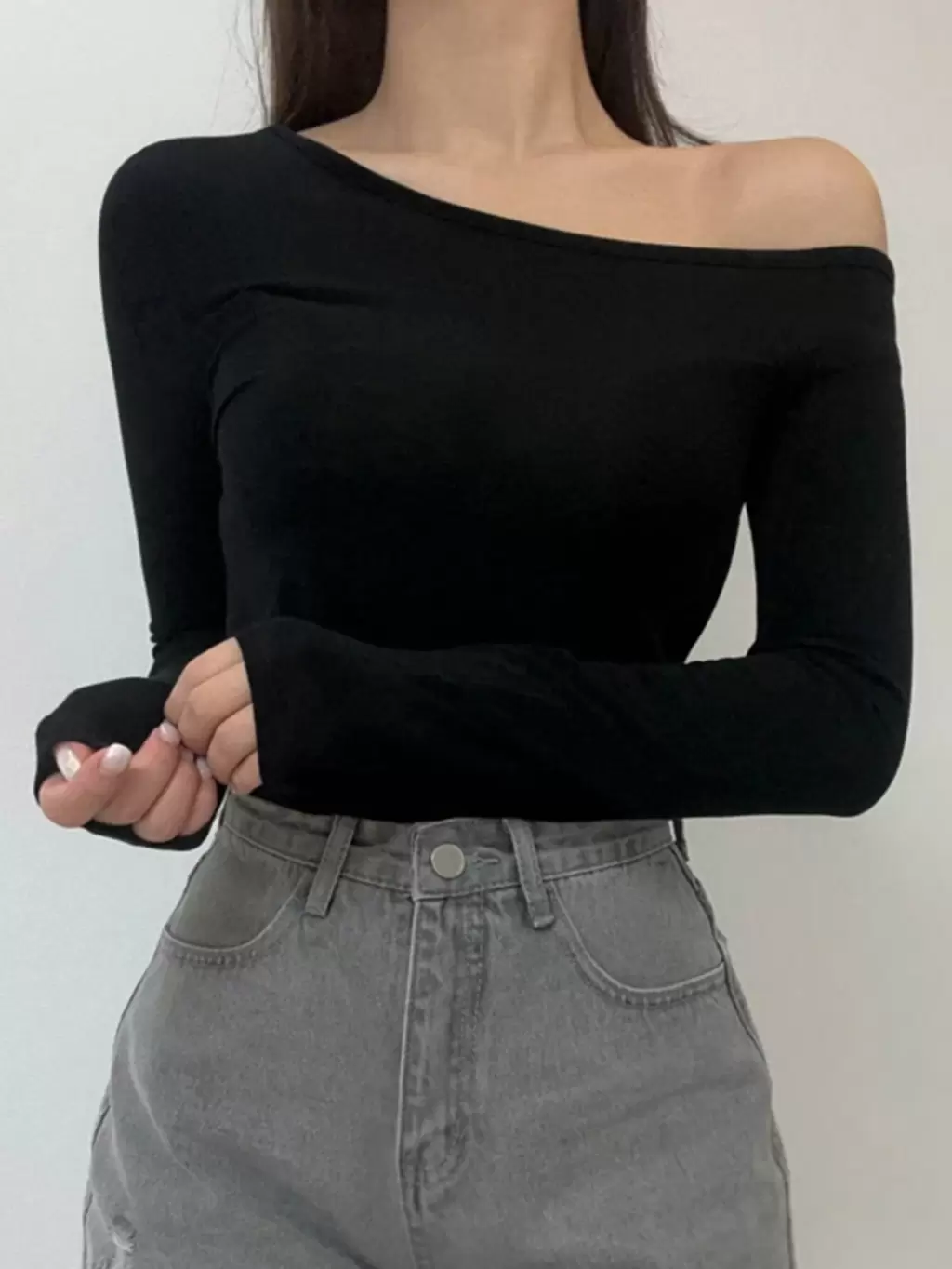 Solid Asymmetrical Neck Tee Long Sleeve Women Tops