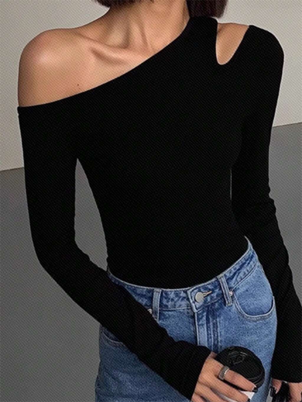 Women Casual Solid Color Asymmetric Collar T-Shirt, Spring And Autumn,Back To School Clothes Long Sleeve Women Tops